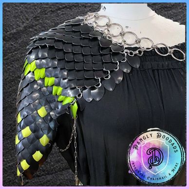 Using anodised aluminium or acrylic scales with stainless steel rings I build these scalemaille shoulder / collar pieces by hand. Depending on supplies there are an array of colours & styles available. Choose from premade items available or order a custom piece.
